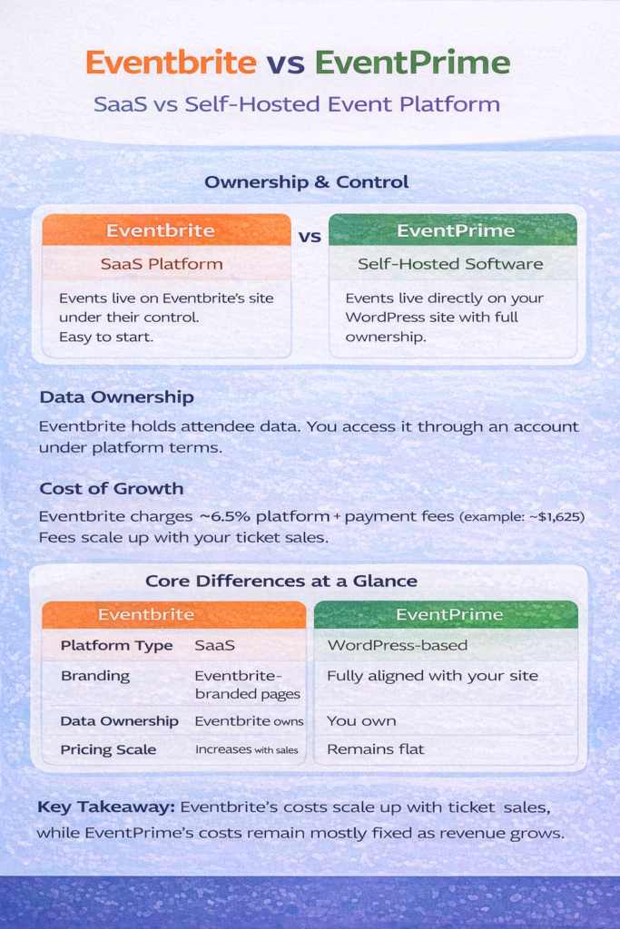 The choice between Eventbrite and EventPrime is not about which platform is “better” in isolation. It is about whether you want to rent an event platform or own an event system.