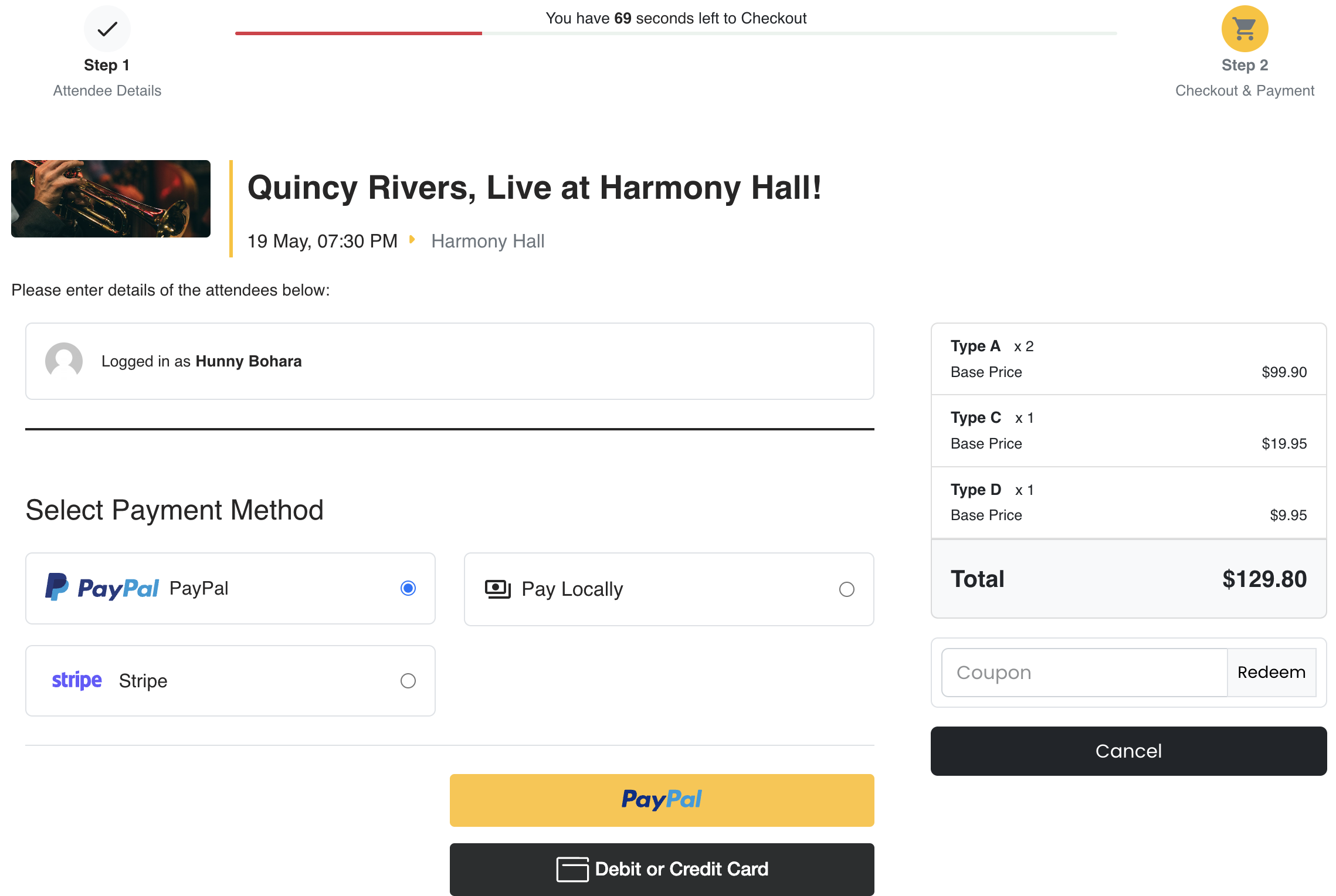 Home / Getting Started / Frontend Screenshots / user-and-payment-stepuser-and-payment-stepMay 16, 2023 EventPrime Leave a Reply Cancel replyYour email address will not be published. Required fields are marked *Name * Email * Website Comment * Save my name, email, and website in this browser for the next time I comment. Δ previousFrontend Screenshots