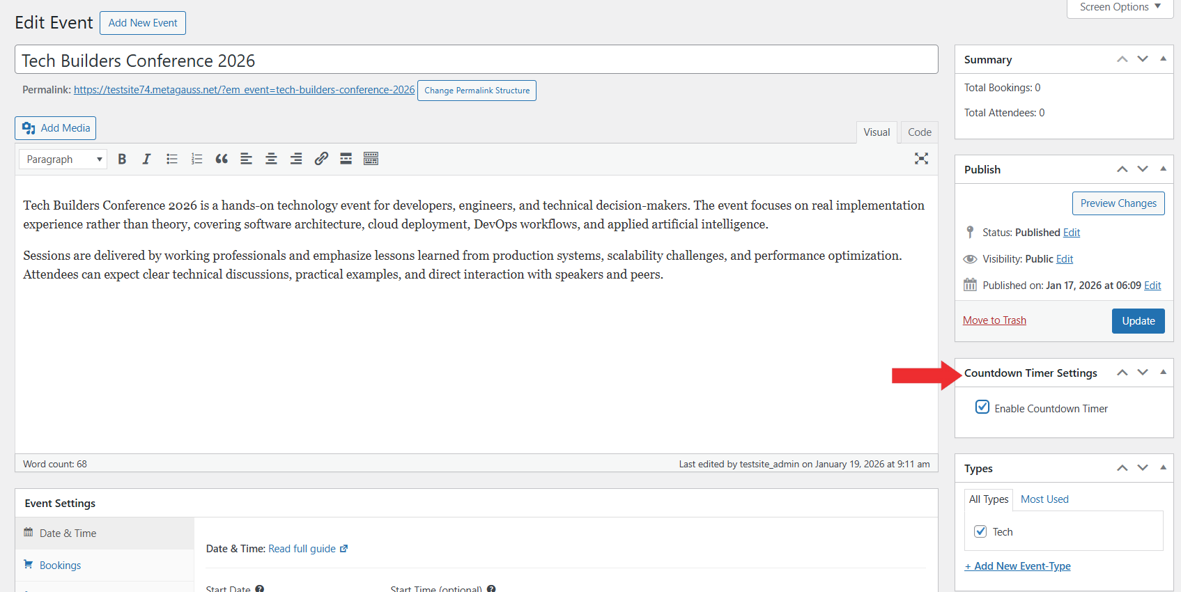 1. On the Edit Event page, locate the Countdown Timer Settings metabox.