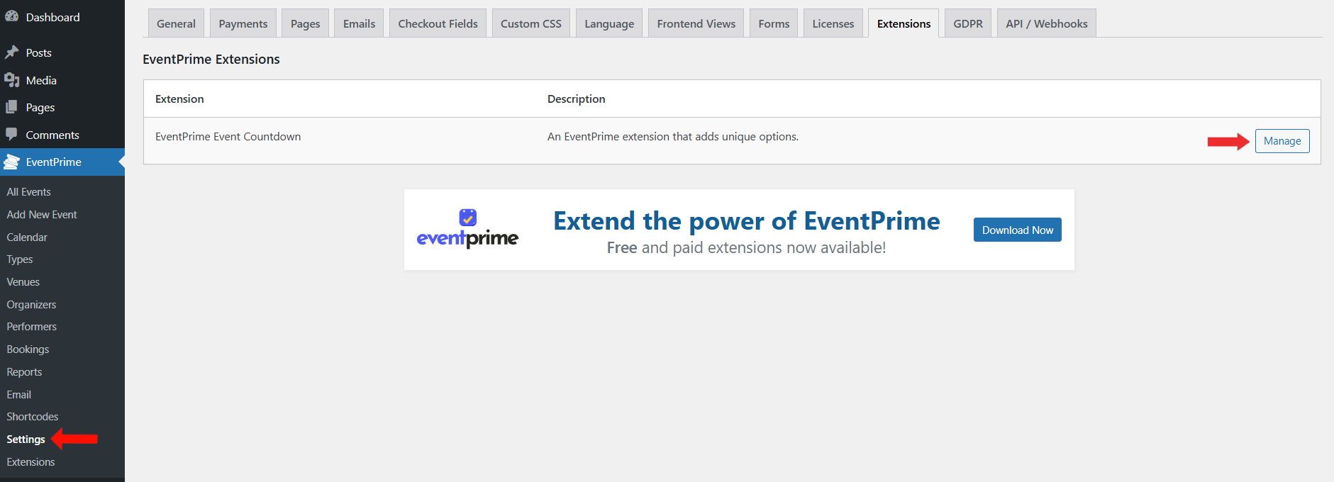 2. Open the Extensions tab, locate EventPrime Event Countdown, and click the Manage button.
