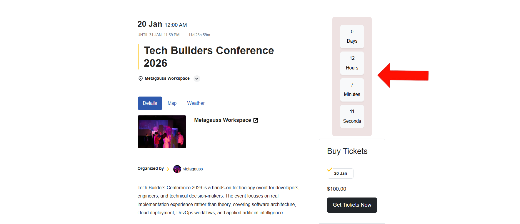 Once the Countdown Timer is enabled, a countdown timer widget appears on the Event Details page. The timer automatically counts down to the Event start time based on the configuration you set in the Countdown Timer Settings.