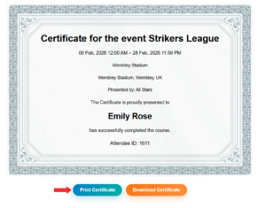 Home / Configure / How to Add Attendee Certificates for Events on WordPress Site / Print certificate button frontend