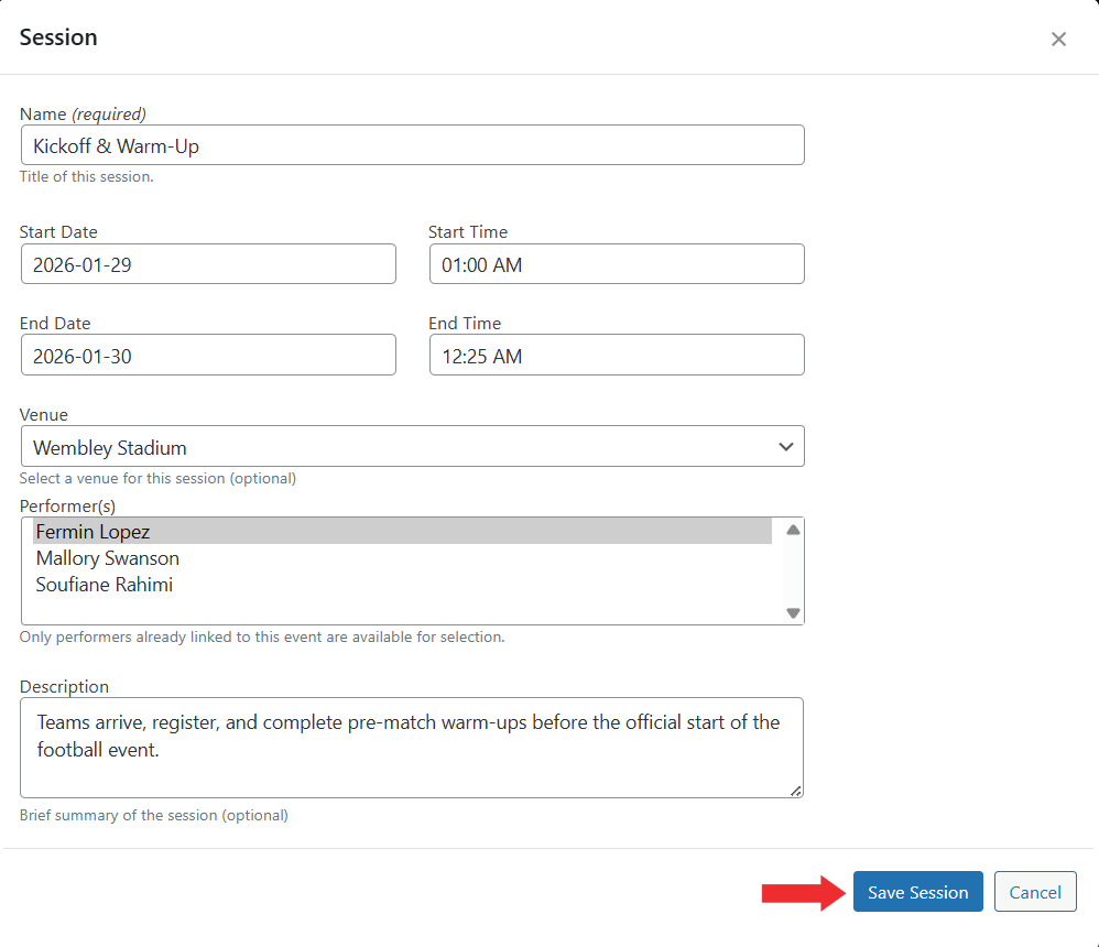 - Click the Add Session button to create a new session for the Event.
