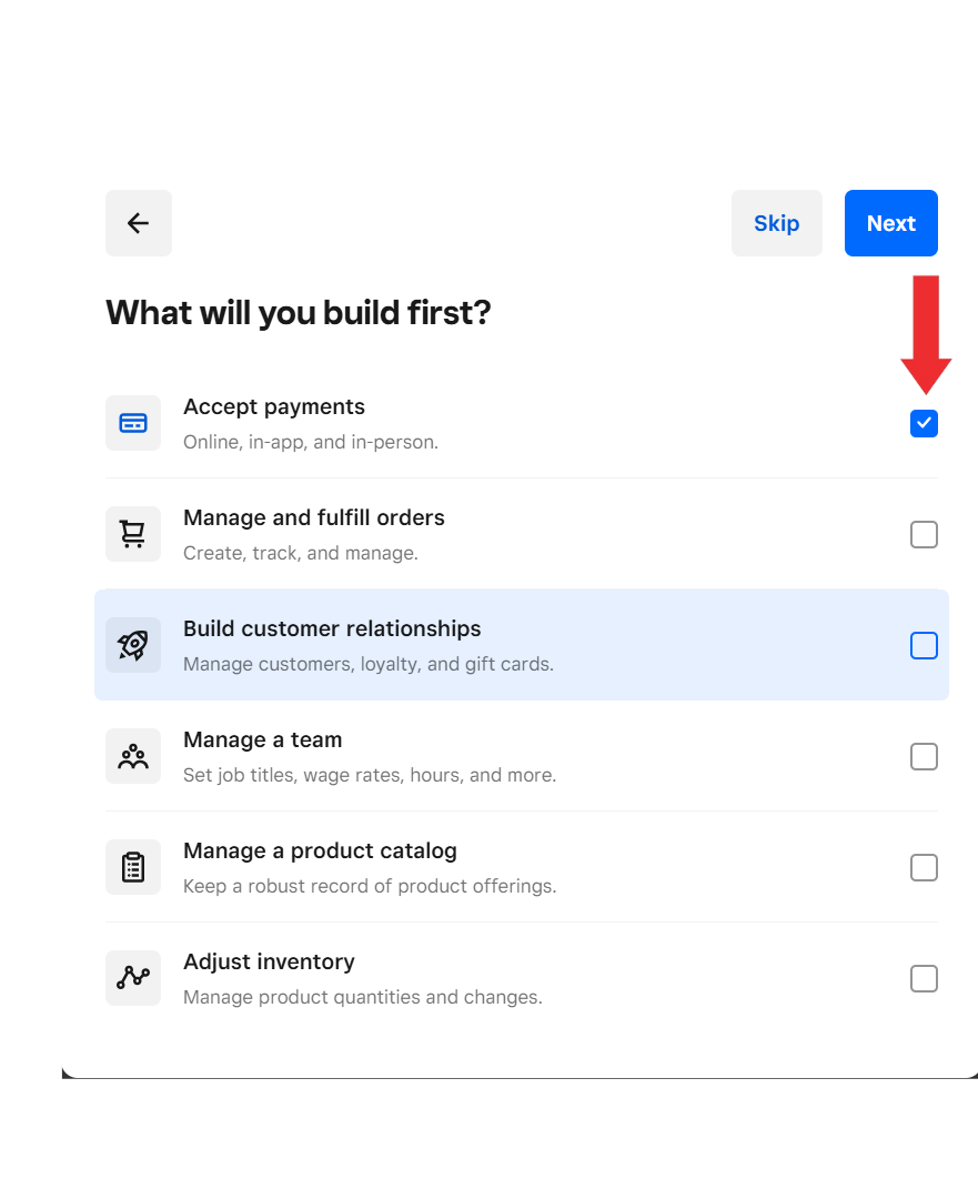 Choose Accept Paymentsas the service for your application, which enables it to process Event Booking transactions through Square.