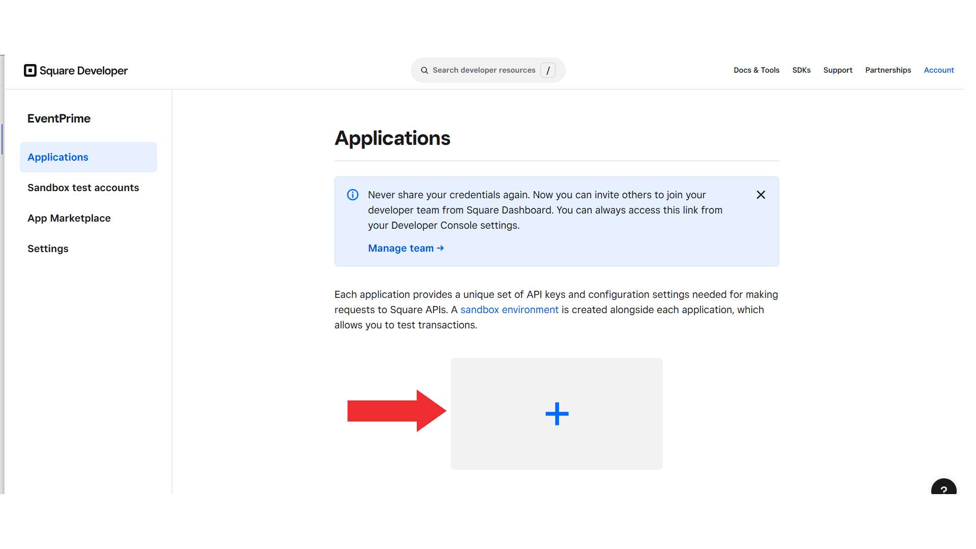 In the Applicationstab of your Square Developer Console, click the ‘+’ icon to create a new application that will be linked with EventPrime.