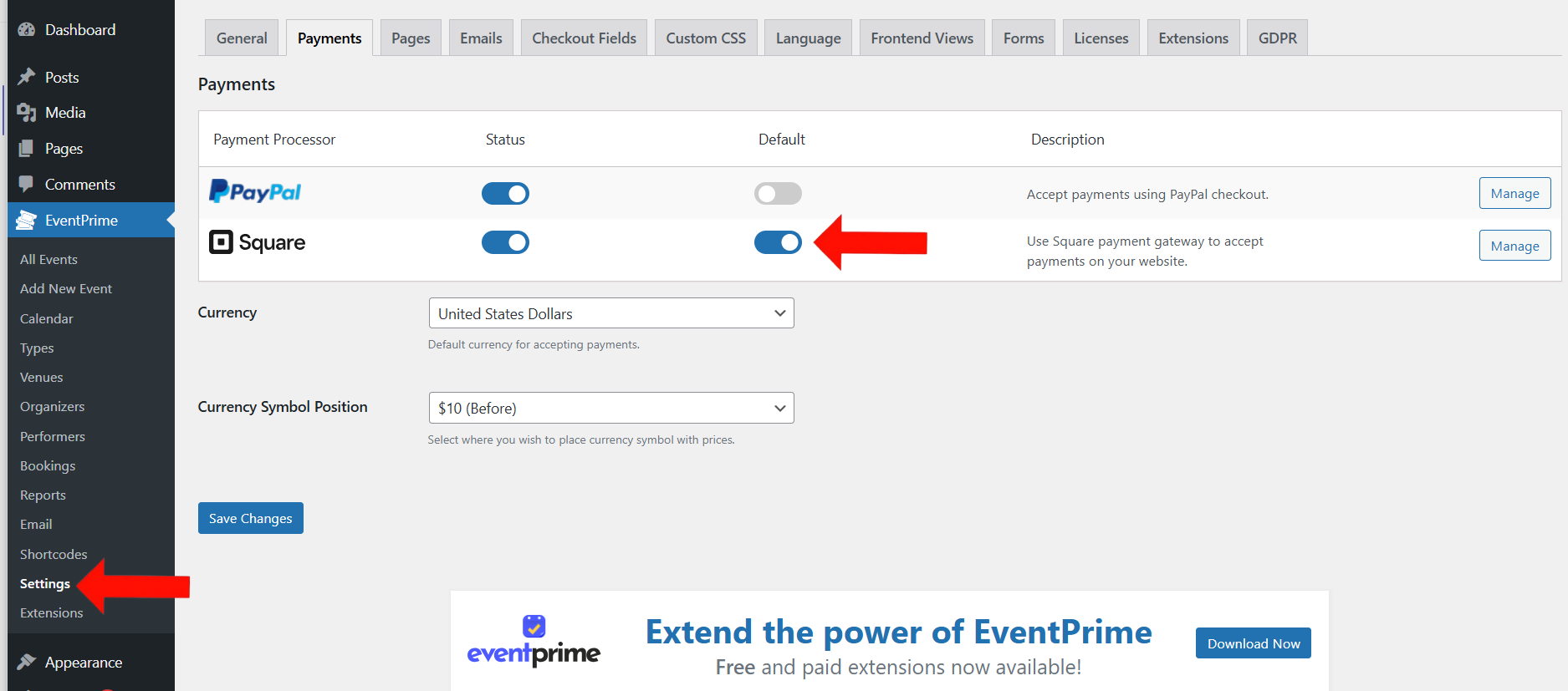 Make sure you have EventPrime and the Square Payments extension installed and activated on your WordPress website. If you do not yet have the extension, you can get it here: Get the Square Payment Extension.