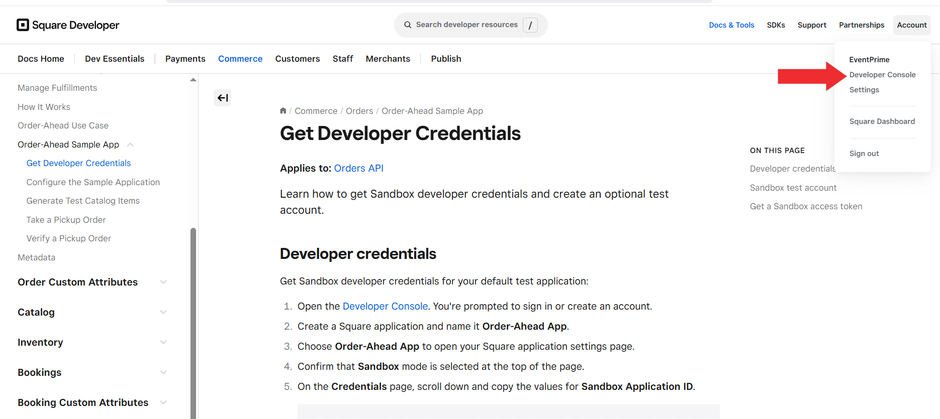 1. Sign in to the Square Developer Portal and access the Developer Console