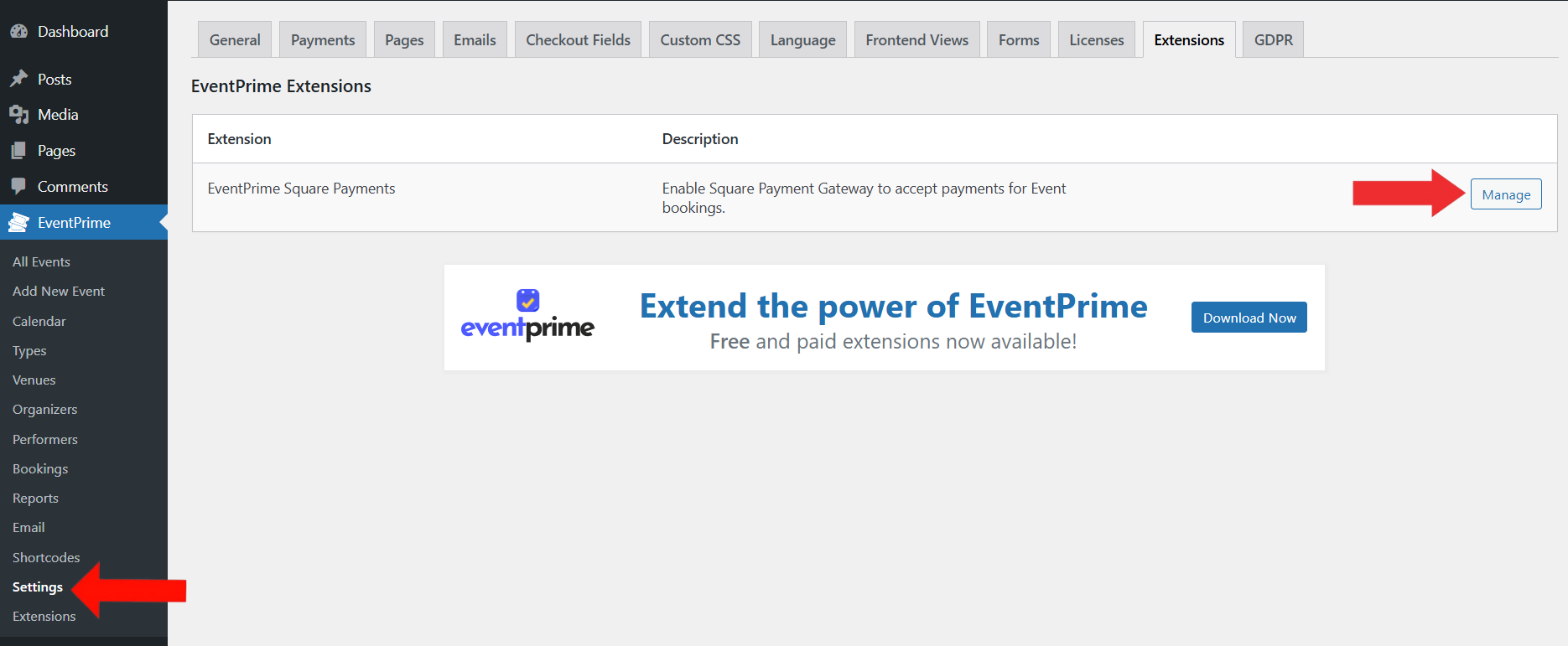 Go to Extensions tab and click on Manage button for EventPrime Square Payments extension.