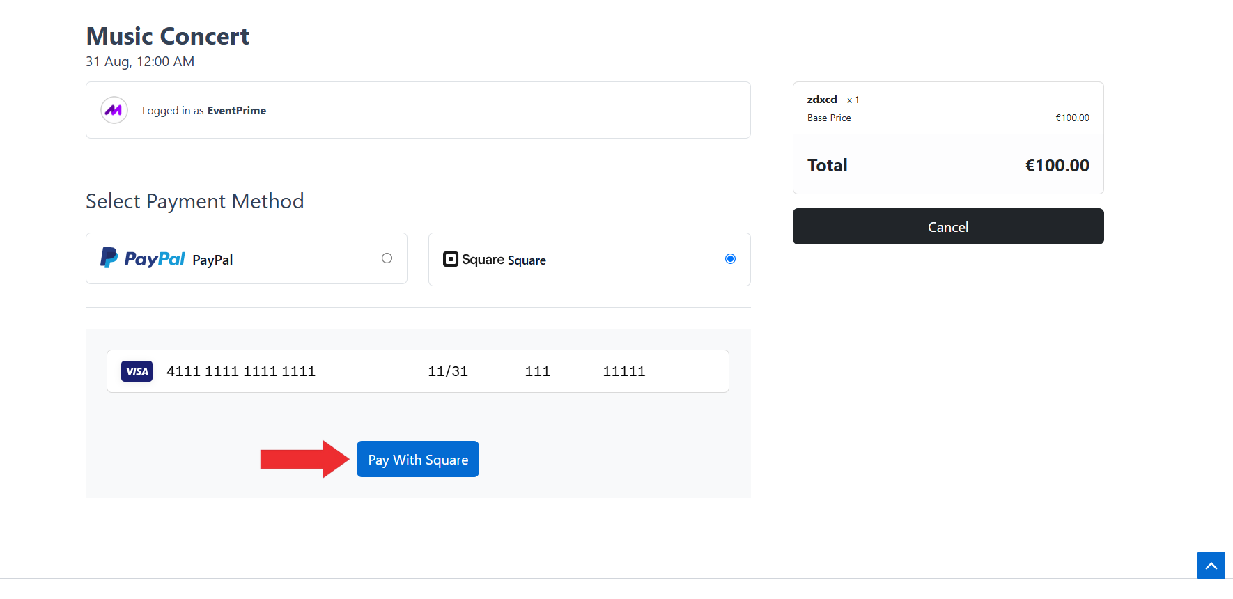 The Square Payments extension in EventPrime allows Organizers to accept secure event booking payments directly on their WordPress site. By connecting with the Square Developer Console, you can create an application, retrieve credentials, and configure them within EventPrime. The extension supports both Sandbox (testing) and Production (live) environments for flexibility. Organizers may also set Square as the default gateway to simplify checkout. On the frontend, attendees can pay seamlessly with Square, and successful payments confirm Bookings instantly. This integration ensures a professional, fast, and reliable payment experience for both Organizers and attendees.