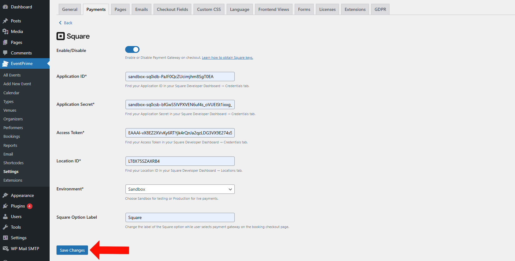 9. Open Square Payment Settings in EventPrime