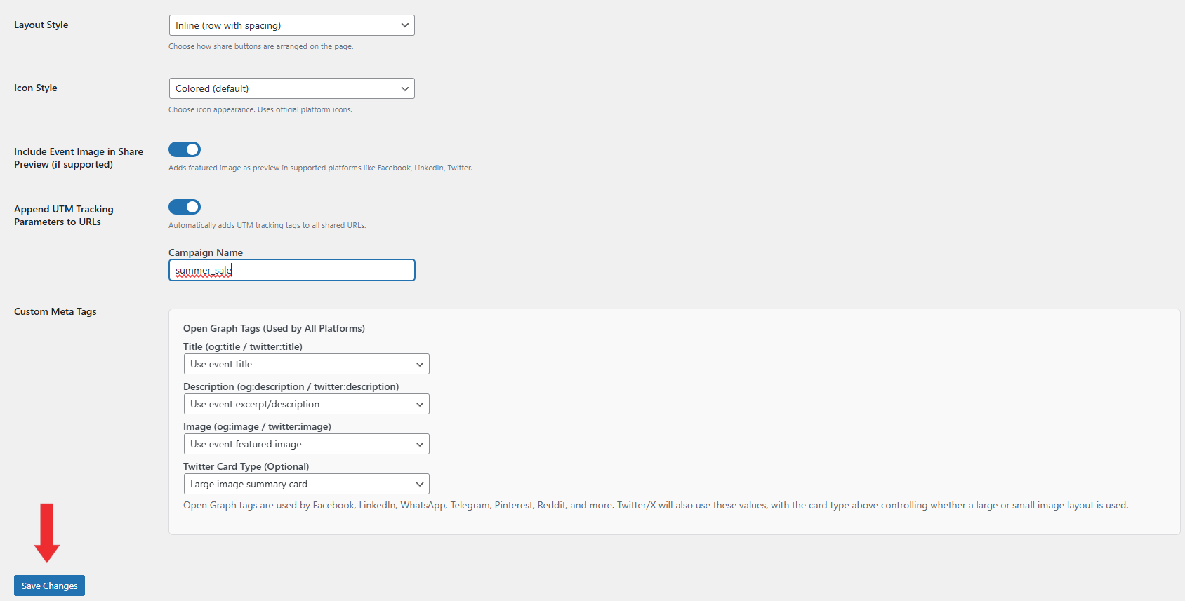 • Enable Include Event Image in Share Preview to use the Event’s featured image in link previews on supported platforms.