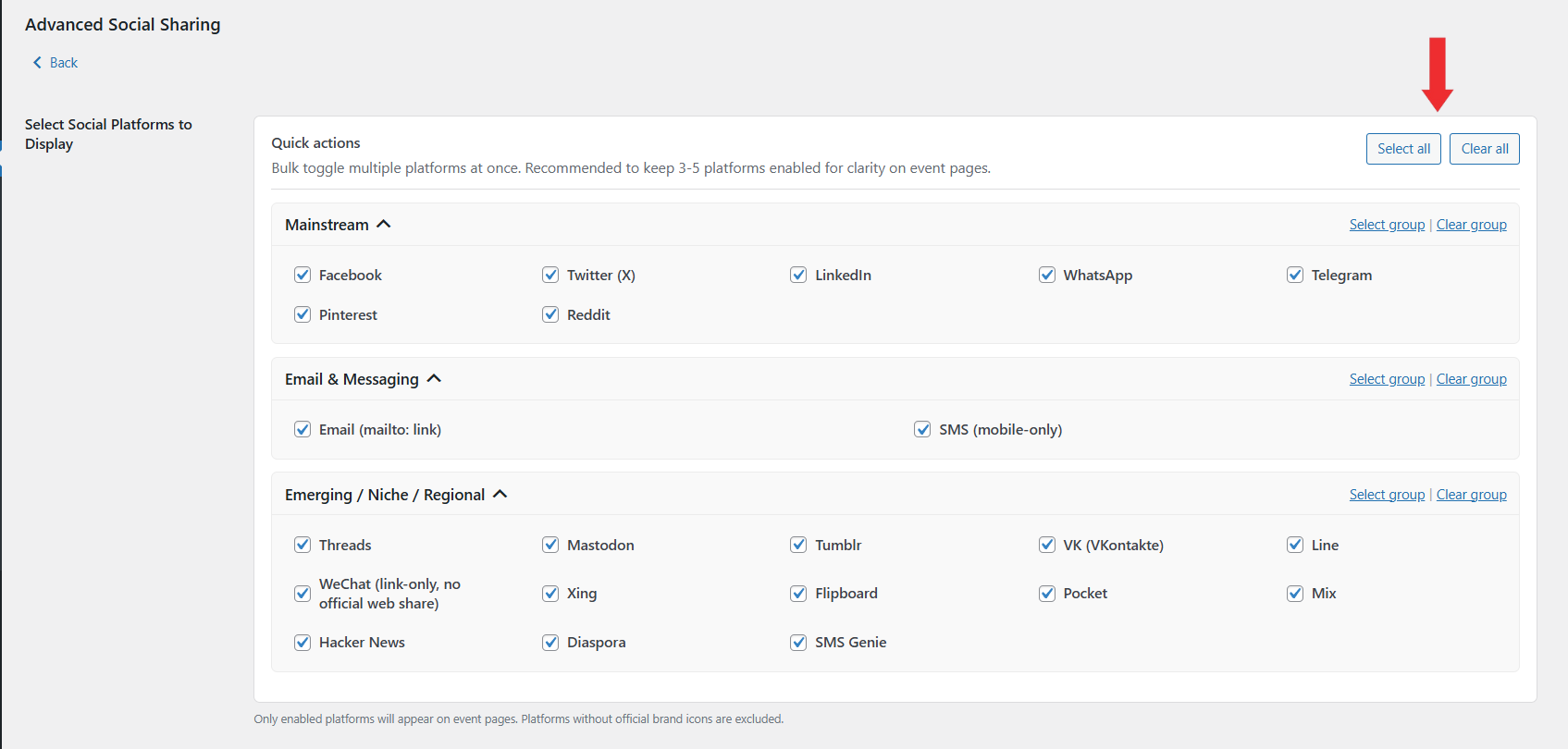 • Choose the social media platforms you want to enable.