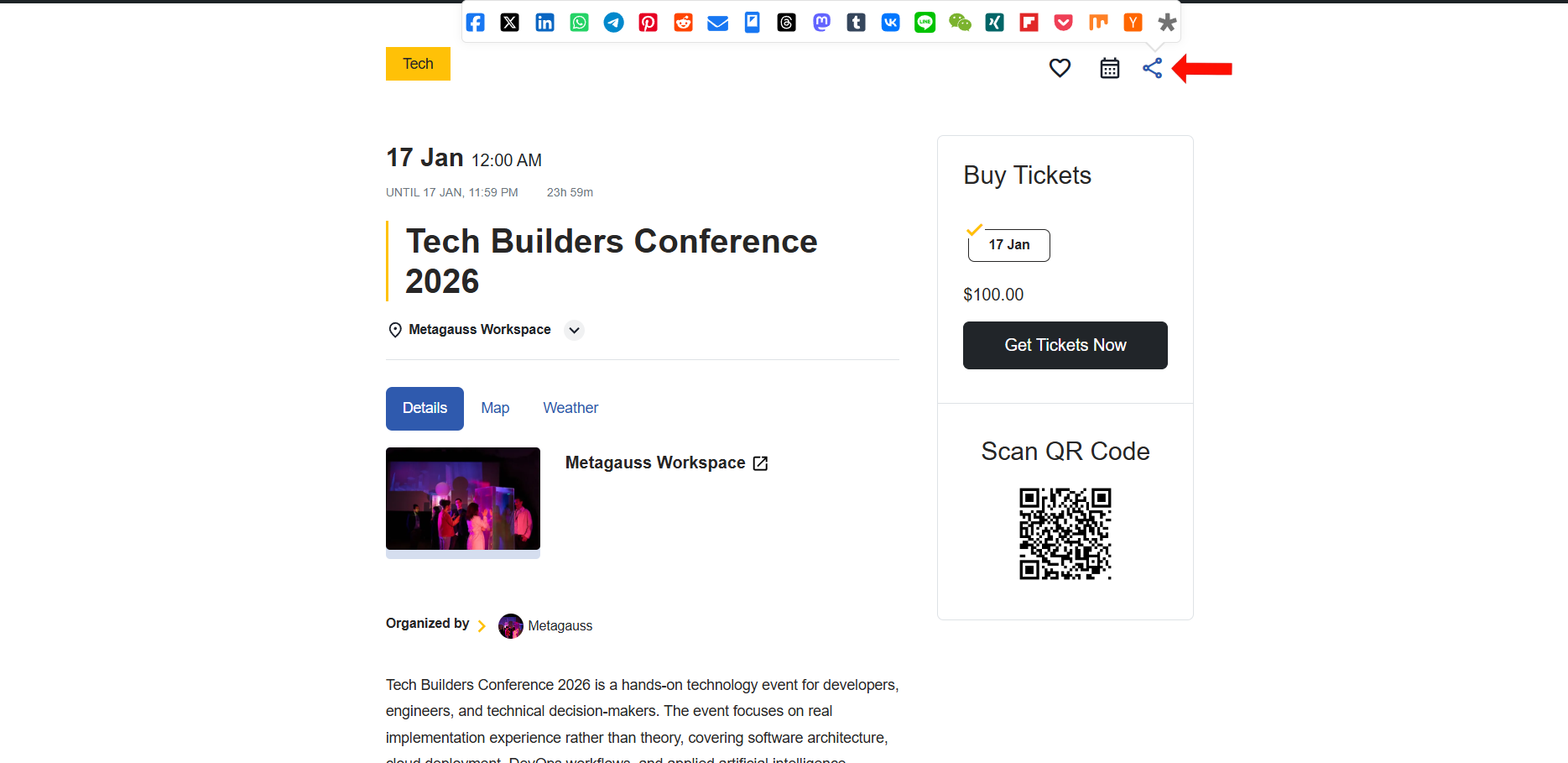 The Advanced Social Sharing extension for EventPrime replaces the default Event sharing option with a powerful, fully configurable social sharing system. It allows administrators to control which social platforms users can share Events on, how share buttons are displayed, and how Event previews appear across different platforms.