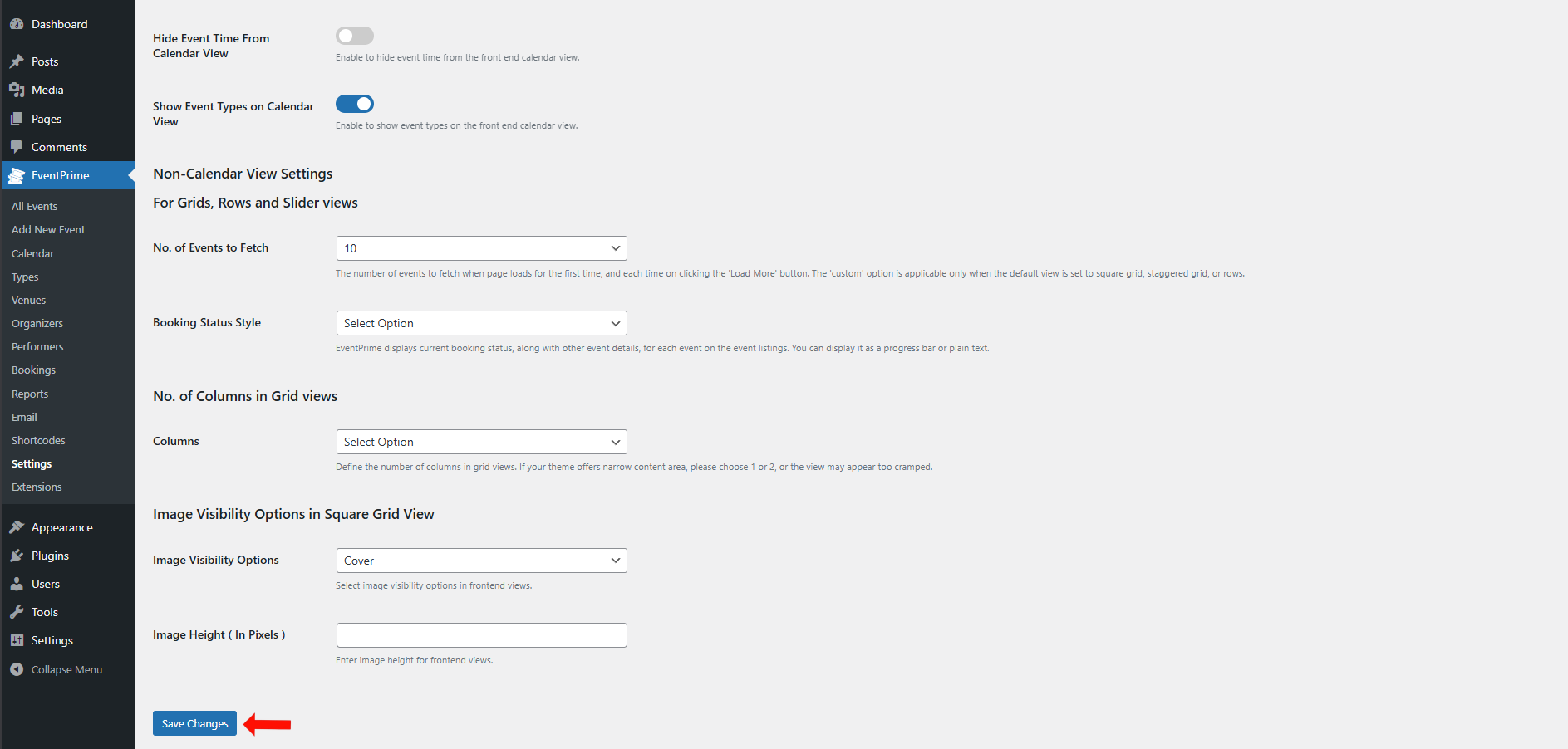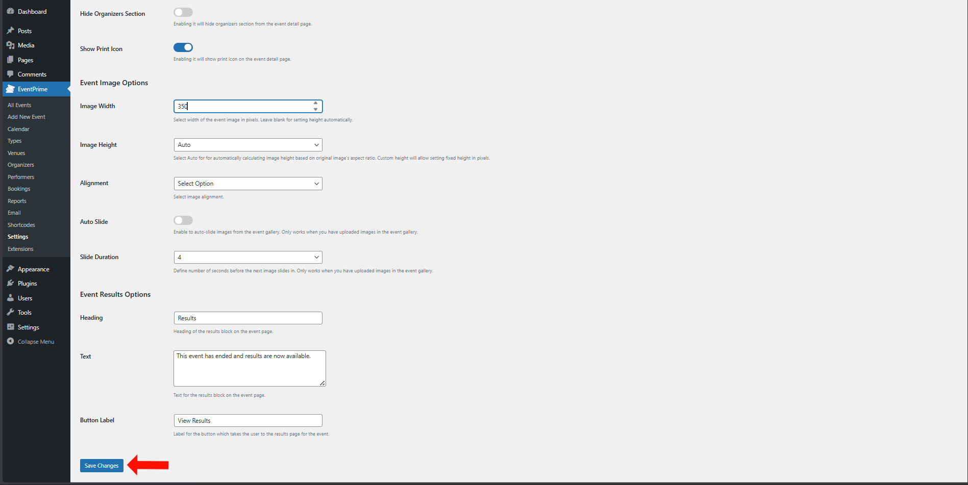 After updating Event options, click Save Changes button.