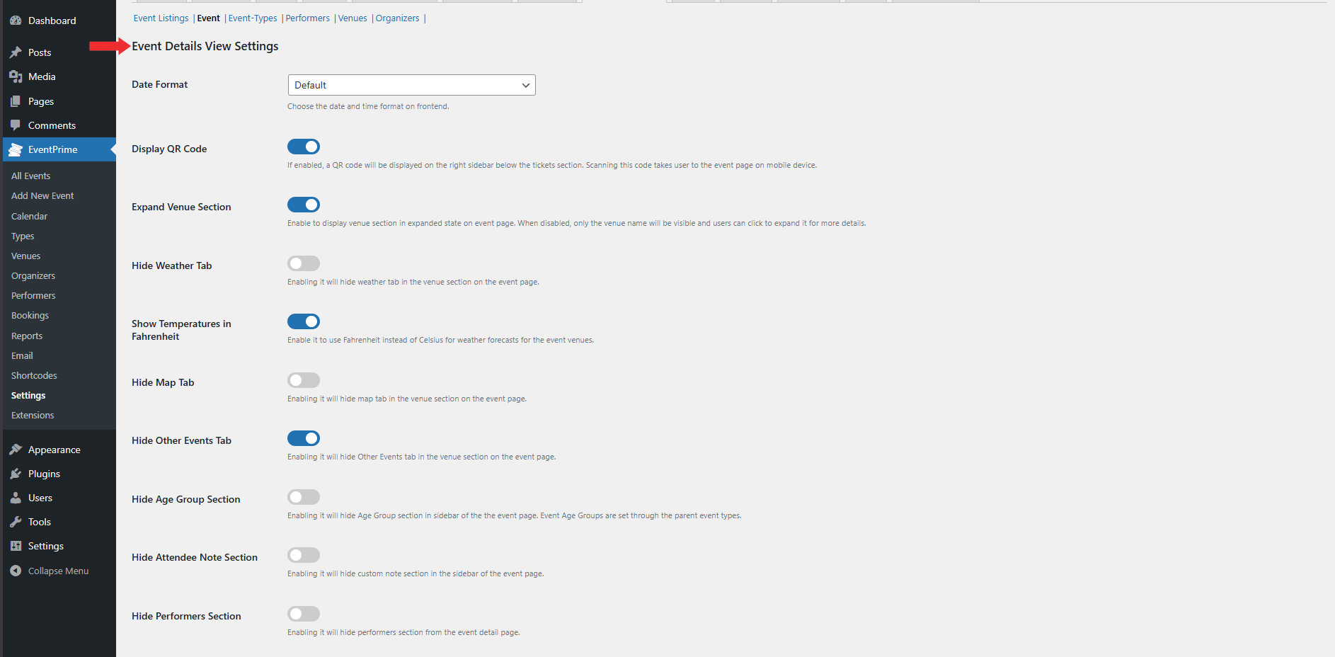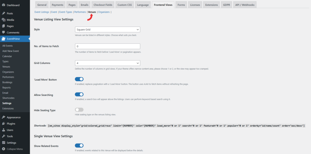 The Frontend Views settings in EventPrime control how Events and related content appear across listings and detail pages. Proper configuration ensures consistent layouts, accurate visibility, and structured presentation of Events, Performers, Venues, Organizers, and Event Types.