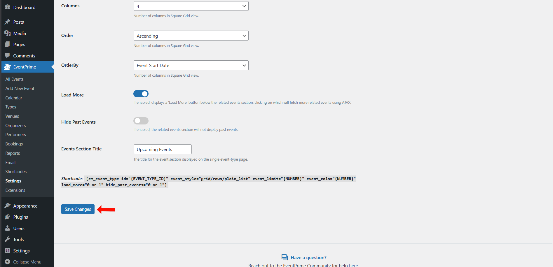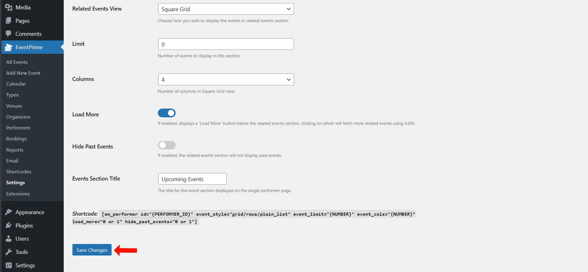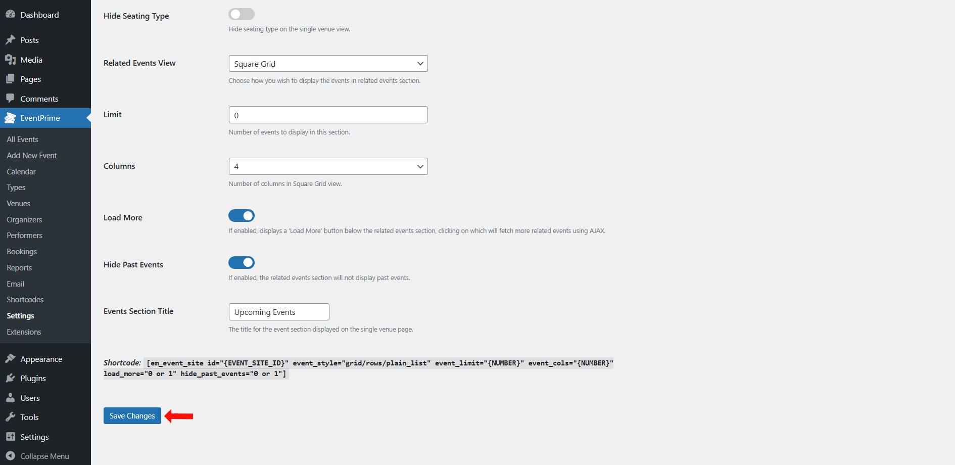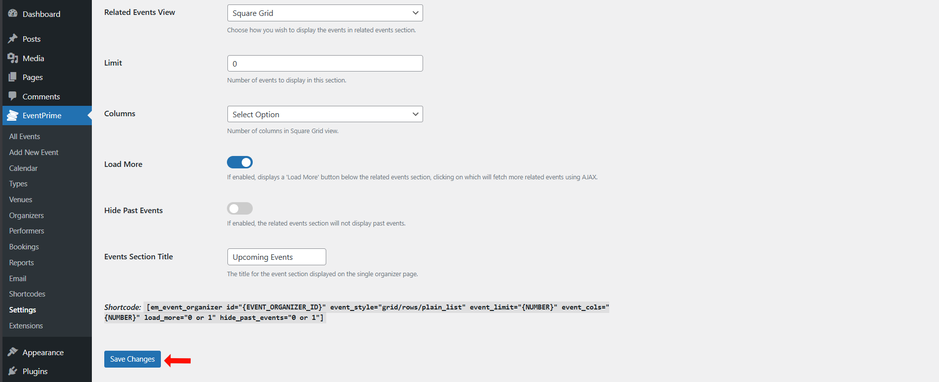 After configuring Event Listings options, click Save Changes button.