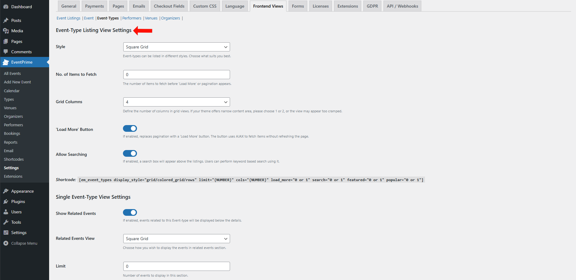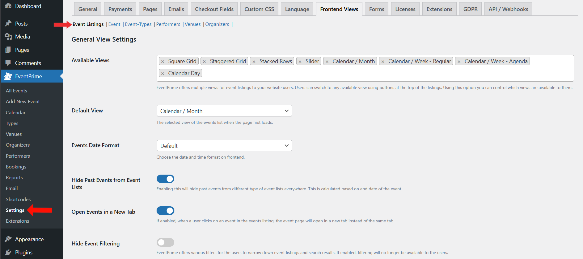 Accessing and Configuring Frontend View Settings in EventPrime