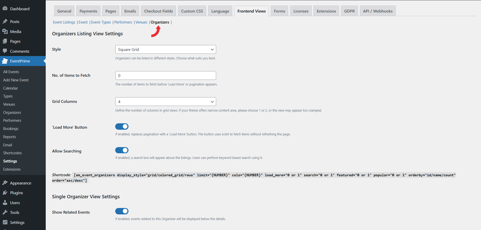 - ‘Load More’ Button: Enable this option to replace default pagination with a Load More button. Additional Organizers will load dynamically using AJAX without refreshing the page.