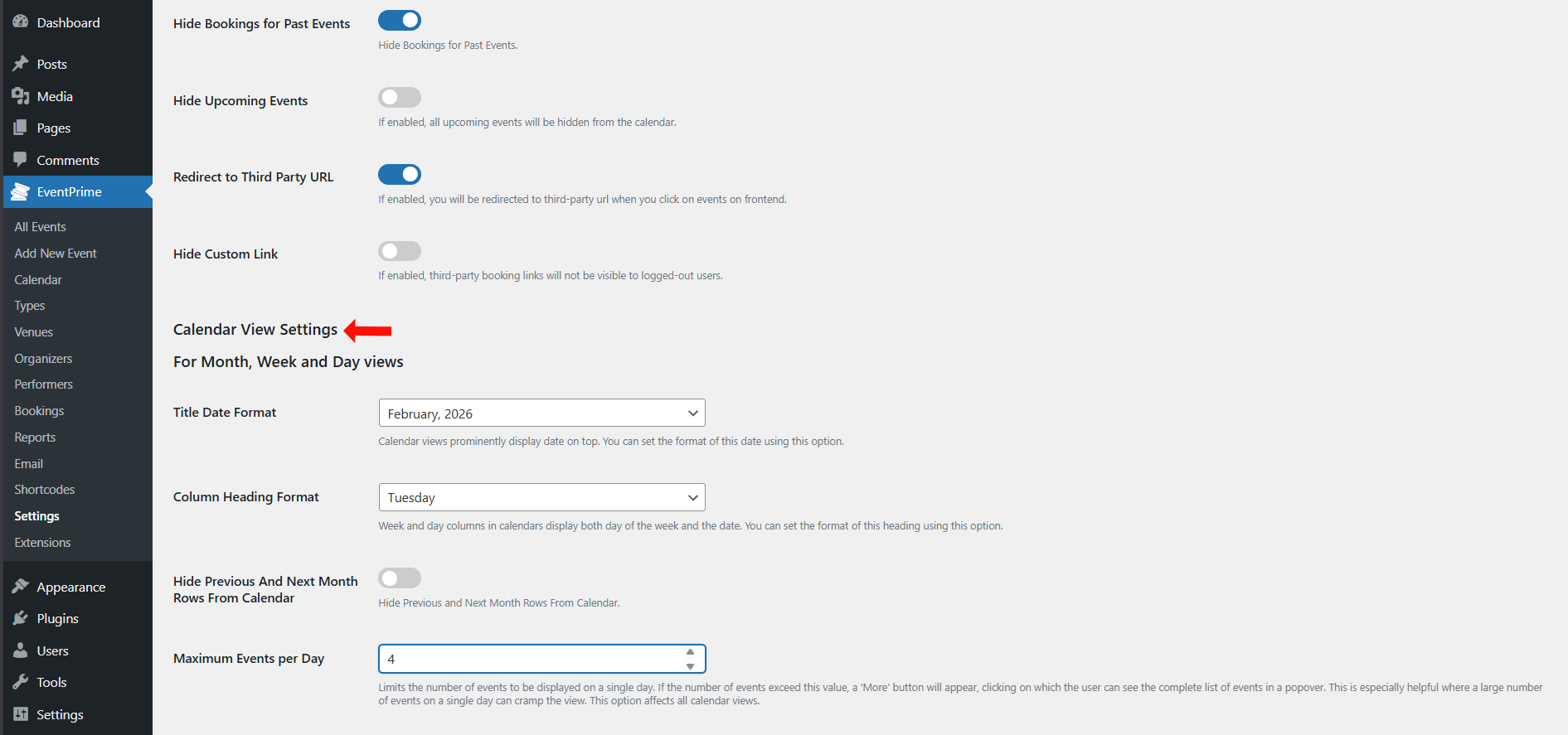 - Maximum Events per Day: Limits how many Events display per day before a “More” option appears.