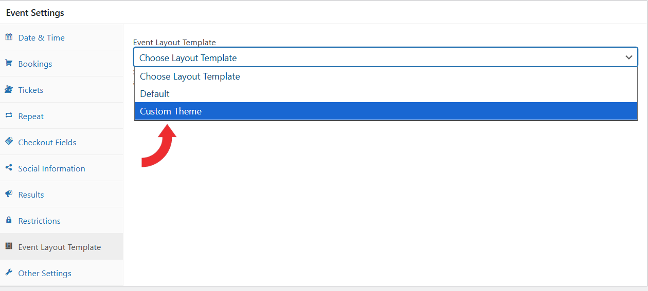 - On the Edit Event page, Go to the Event Settings metabox and select the Event Layout Template tab.