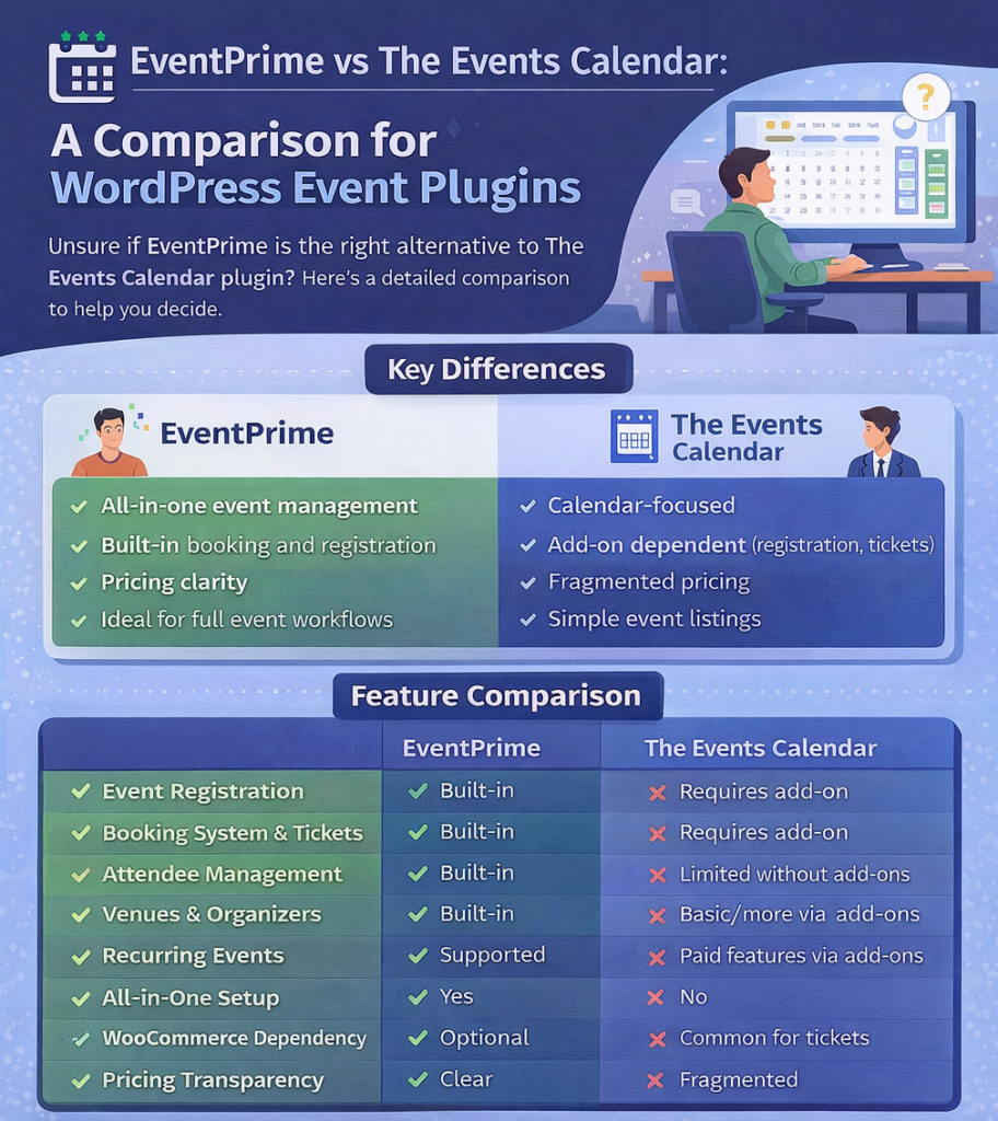 This article provides a detailed, side-by-side comparison of EventPrime vs The Events Calendar, written from the standpoint of real-world event workflows. Instead of focusing on marketing claims, we look at how each plugin behaves in practice and which type of user benefits most from each approach.