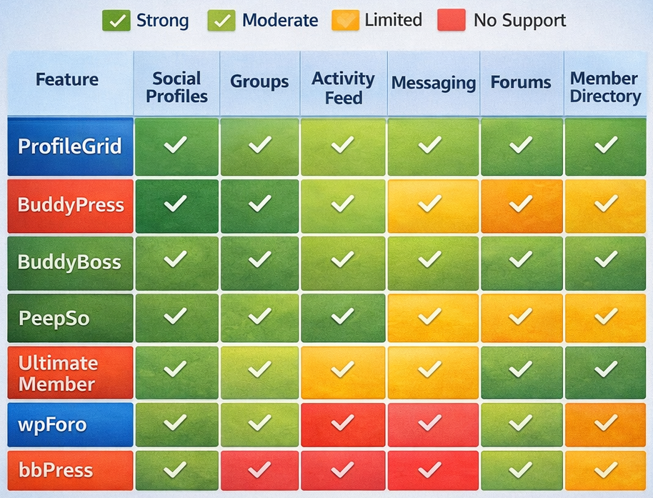 | Plugin | Social profiles | Groups | Activity feed | Messaging | Forums | Member directories | Best “community shape” |