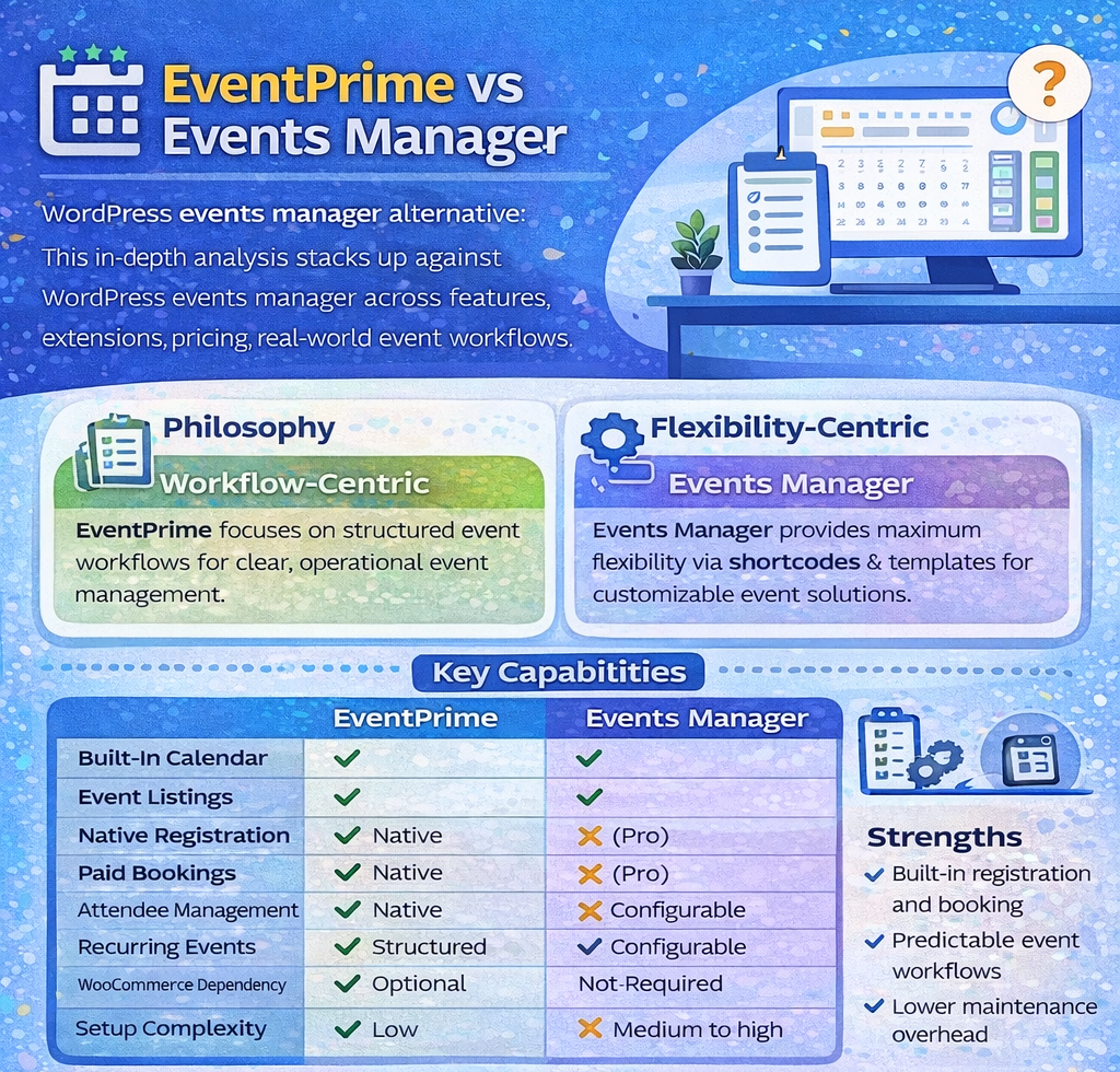 This guide evaluates EventPrime and Events Manager from a system-design and real-world usage perspective. Instead of repeating feature lists, it looks at how each plugin behaves over time, how extensions are used, and which types of event-driven sites benefit most from each approach.